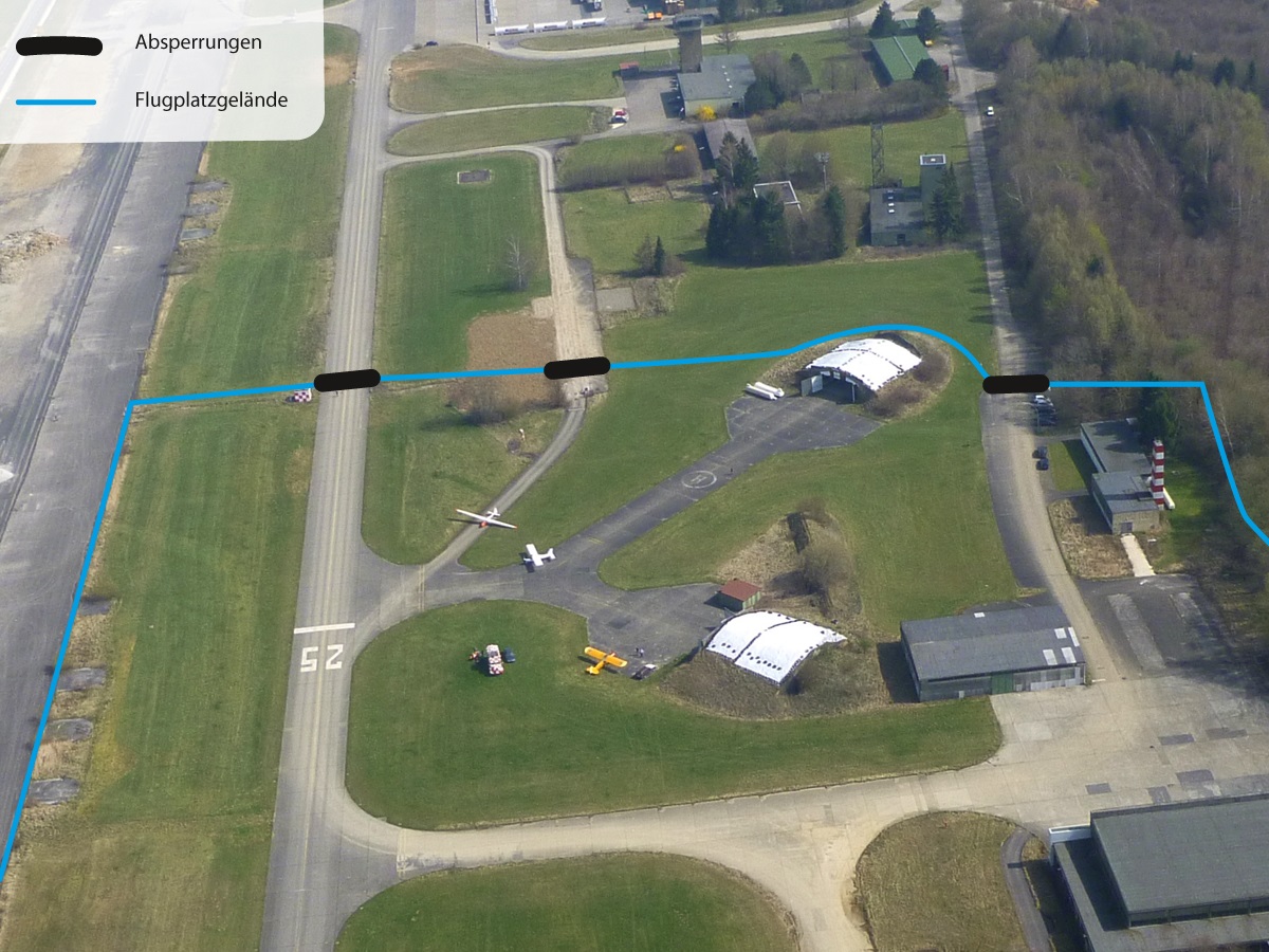 Alle (betonierten) Zugänge zu unserer Landebahn sind abgesperrt und mit Warnhinweisen versehen. Besonders Segelflugzeuge sind im Flug sehr spät zu hören und können nicht durchstarten.